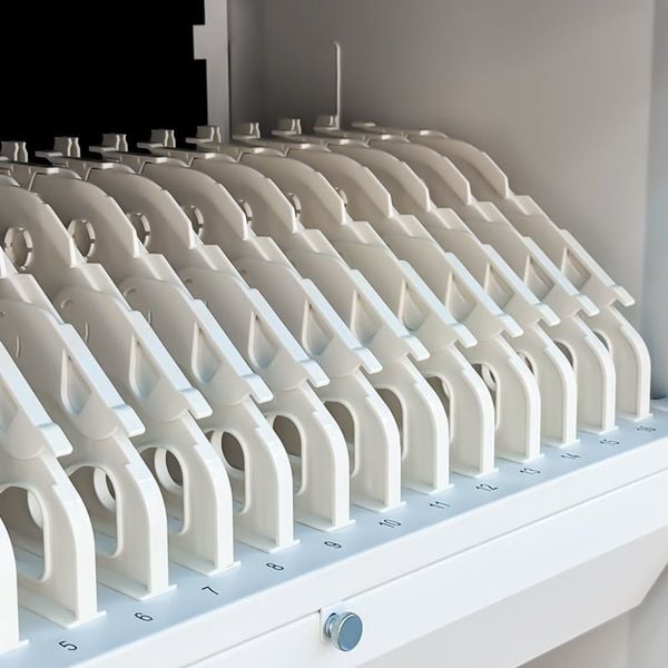 Mỗi thiết bị được đặt trong một khe đứng (vertical bay) riêng biệt, giúp tiết kiệm diện tích bên trong tủ và giảm tình trạng chồng chéo dây sạc.