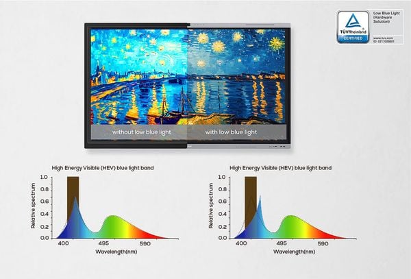 MAXHUB E3 Series được thiết kế với mục tiêu bảo vệ sức khỏe thị giác trong môi trường giáo dục hiện đại. Nhờ công nghệ lọc ánh sáng xanh tiên tiến, màn hình giúp giảm thiểu tác động của ánh sáng xanh có hại (400–450nm), bảo vệ mắt khỏi mỏi và khô khi sử dụng trong thời gian dài. Với tỷ lệ phát xạ ánh sáng xanh cực thấp chỉ 11.25% và chứng nhận TÜV Low Blue Light, thiết bị đảm bảo sự thoải mái cho giáo viên và học sinh trong suốt buổi học.
