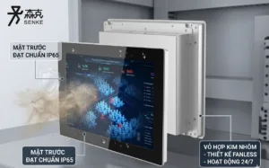 Thiết bị sở hữu vỏ hợp kim nhôm nguyên khối chắc chắn, kết hợp thiết kế fanless (không quạt) giúp giảm bụi bẩn và tăng độ bền khi vận hành liên tục.Mặt trước đạt chuẩn IP65 chống bụi và nước, đảm bảo hoạt động ổn định trong môi trường khắc nghiệt như nhà máy, khu chế xuất hoặc môi trường có độ ẩm cao.