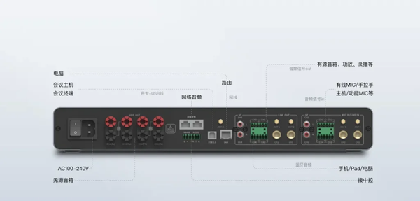 Công suất 4×300W mạnh mẽ đáp ứng mọi quy mô phòng họp, mang lại âm thanh sống động và ổn định. Thiết bị hỗ trợ đa dạng cổng kết nối, bao gồm USB sound card, dễ dàng tương thích với các hệ thống hội nghị trực tuyến phổ biến.