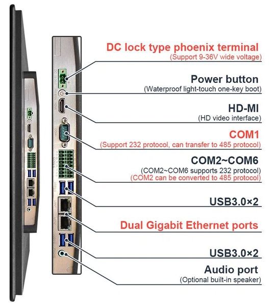 | Cổng COM | 2 cổng COM (RS232), có thể thay thành RS485 hoặc mở rộng thêm 2–4 cổng RS232 |